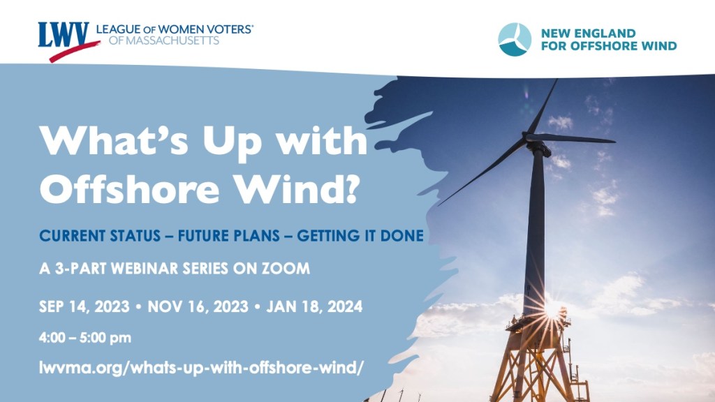 Massachusetts and other New England states are planning on offshore wind as a major factor in meeting renewable energy generation and emissions reduction goals as we transition off fossil fuels. Join us as we take a deep dive into the Northeast’s offshore wind industry and learn about the value of critical offshore wind projects and threats to their timely deployment. Each session has a separate Zoom registration. Sign up for one, two, or all three! See full descriptions and registration links for each session on the LWVMA website. This series is co-hosted by LWVMA and New England for Offshore Wind (NE4OSW).